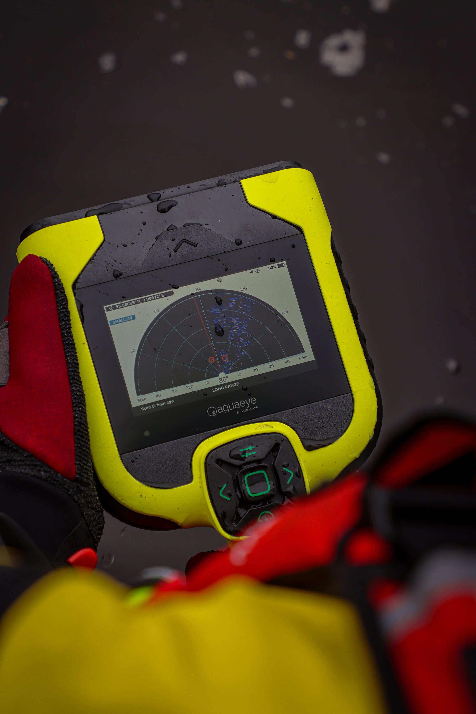 Das AquaEye ist ein mobiles Sonarsystem, das direkt an der Einsatzstelle eingesetzt wird. Es wird ins Wasser gehalten und sendet Sonarwellen aus, deren Echos in Echtzeit von einer integrierten KI ausgewertet werden. Das System erkennt menschliche Körper zuverlässig und zeigt ihre Position unmittelbar auf dem Display an. So lassen sich Suchbereiche präzise eingrenzen und wertvolle Minuten sparen.
